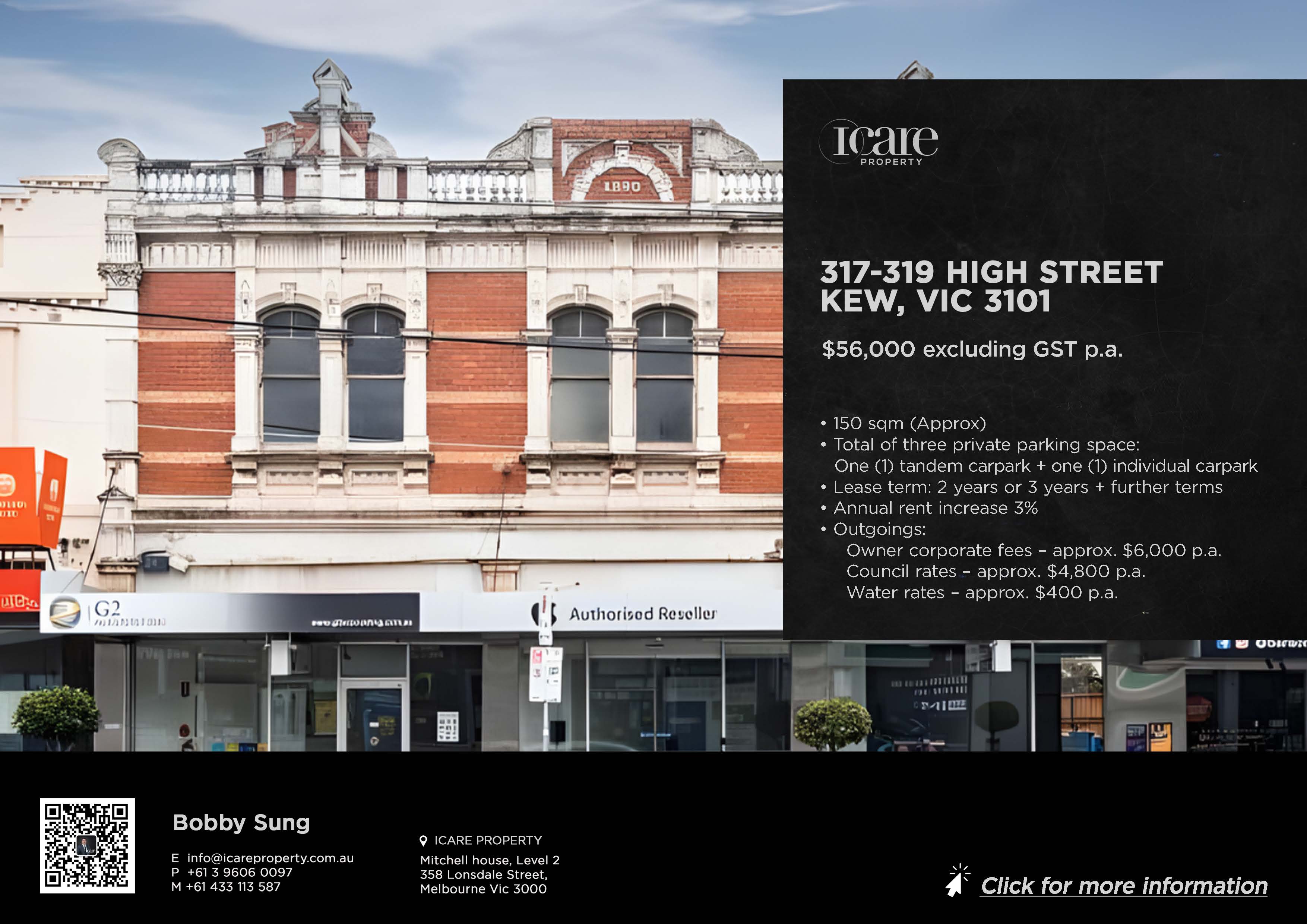 Conveniently situated in the bustling heart of Kew, this shop presents an exceptional leasing opportunity in one of Melbourne’s most sought-after commercial locations. Positioned in a vibrant retail precinct with strong foot traffic, it offers excellent exposure and convenient access to major transport routes. A tram stop (Route 48) is located directly at the doorstep, while a bus stop (Route 304) is just a short walk away. Easy freeway access via the Eastern Freeway also provides seamless connectivity to Melbourne CBD.